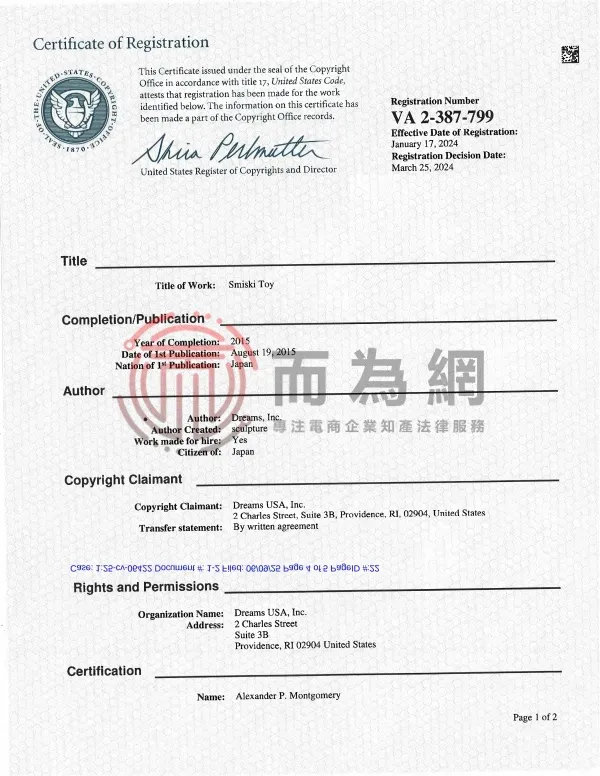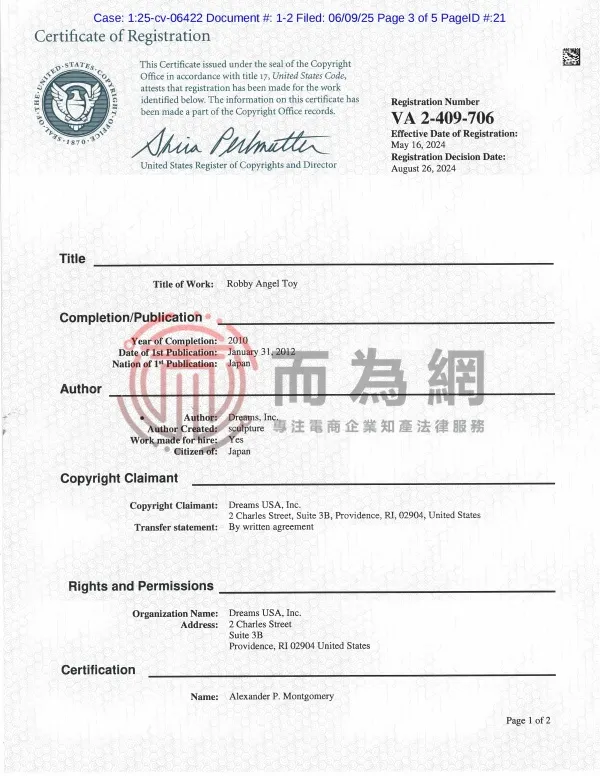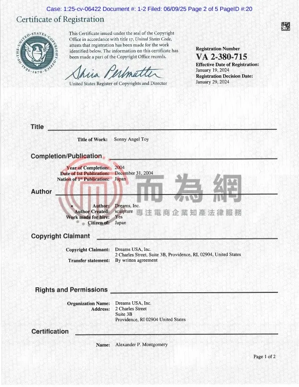 原告DREAMS USA, Inc是日本知名治愈系玩具品牌“SONNY ANGEL”“SMISKI”和“HIPPERS”的创造者与全球运营商。该企业专注于设计充满童趣与温暖的潮流玩具,比如标志性的天使娃娃SONNY ANGEL以及夜光小精灵SMISKI。