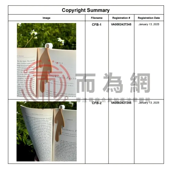 原告Bonney Ruan是一位全职设计师,喜欢将生活灵感融入设计,从而创造了coffe bonney。Cafe Bonney是一个把生活里的小意外变成惊喜的创意品牌,本案涉及的spilled coffee书签灵感就来自咖啡杯打翻的瞬间。