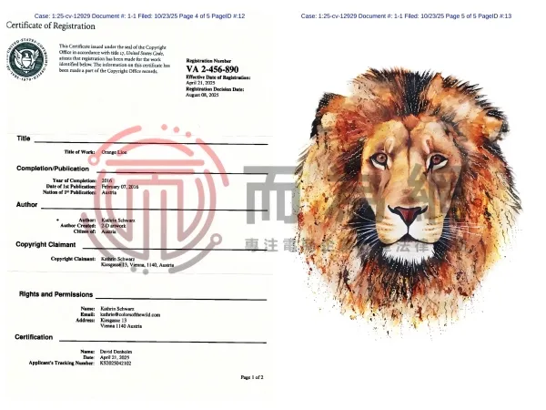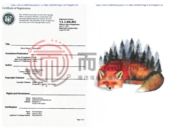 25-cv-12929 涉案店铺46家!这两张狐狸、狮子动物插画速排查下架!