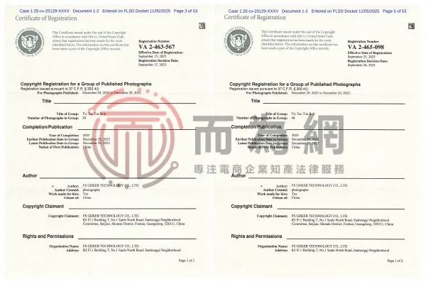 本案涉及两项版权证书,包括48张产品图片,未经授权以下产品图及原告同款产品都要谨慎上架,否则会有侵权风险!