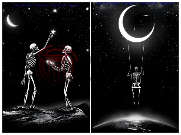 JUNAID MORTIMER的艺术旅程充满转折,直到2018年重新执笔创作,开启黑白骷髅的奇幻宇宙。在他的工作室里,每幅作品都经由他亲手绘制、精心包装。这些戴着礼帽、身处超现实场景的骨骼形象,被赋予哥特式的优雅和戏剧张力,展现出独特的暗黑美学。