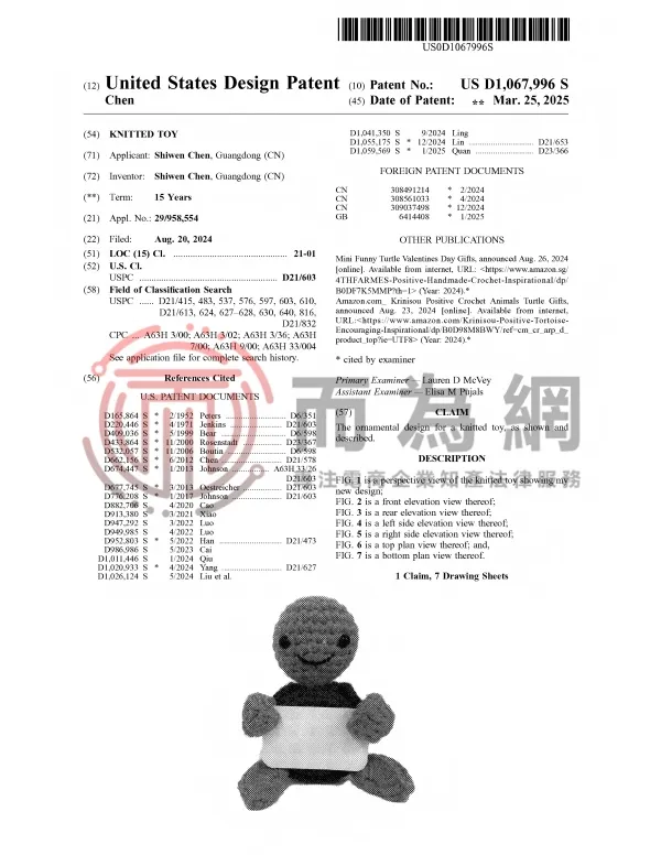 原告SHIWEN CHEN是一位国人卖家,旗下有两款针织玩偶外观专利。这两款针织玩偶均是纯手工制作,材料使用羊毛线编织,触感柔软舒适,掌心大小的设计方便随身携带,配上一张鼓励卡片,随时随地带来积极能量。