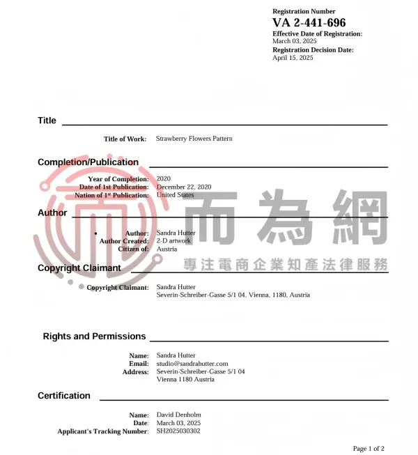 本案涉及的版权信息如下,仅1张草莓小花图片,即使图片不是一模一样,大致设计理念、核心元素相同也会有侵权风险!未经授权以下图片及原告官网的其他作品都不能擅自使用,请卖家们仔细排查,避免侵权!
