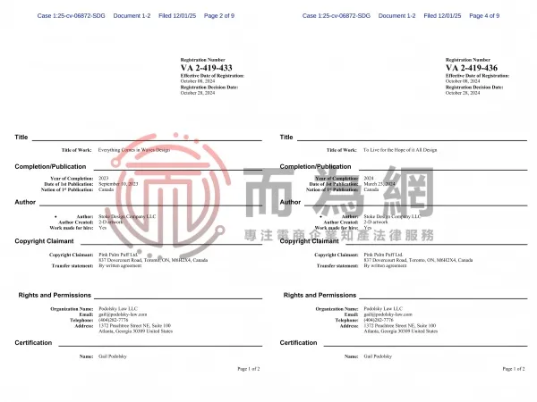 由于本案涉及的具体版权图片暂未公开,以下是诉状中的版权证书,供卖家们参考。未经授权原告官网的原创设计都不能上架,请卖家们仔细排查,避免侵权!
