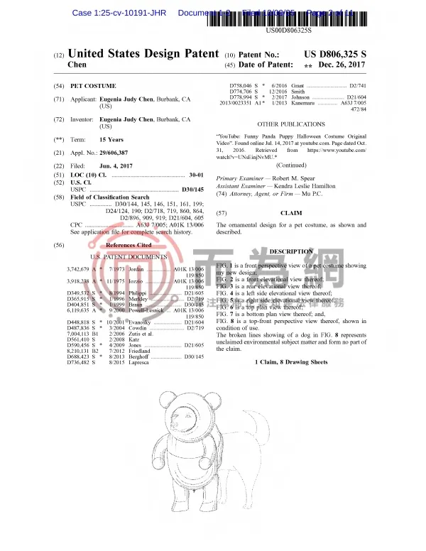 25-cv-10191 SRIPLAW律所代理PANDALOON 宠物服装商标+专利发案!速排查下架!