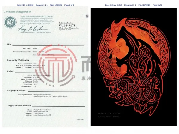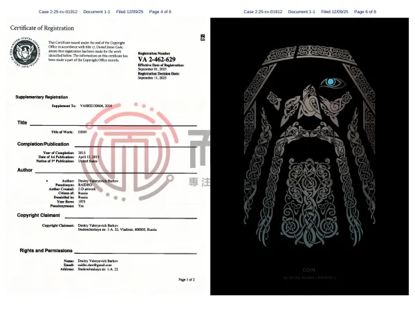 原告DMITRY BARKOV是一位以“浪漫装饰主义”风格为主的俄罗斯艺术家,以笔名RAIDHO活跃在各大创作平台。其创作基于对全球图案文化的探索与融合,以精巧繁复的线条与丰富的象征创作作品。