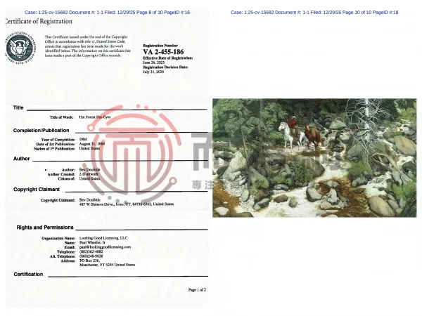25-cv-15682 Keith代理Bev Doolittle 3张水彩版权发案!速排查下架!