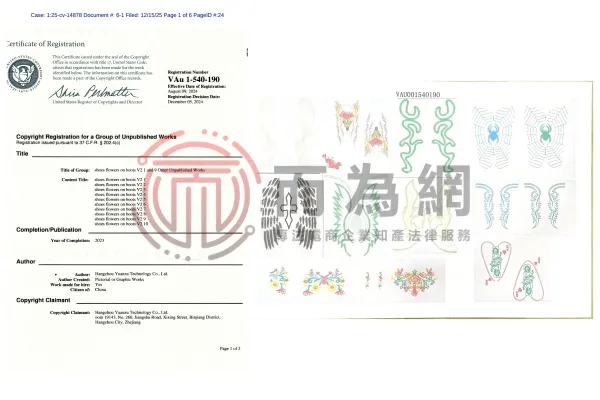 原告Hangzhou Yuanzu Technology Co., Ltd是一家中国企业,专注于将原创艺术与潮流产品相融合。本文两案涉及的三组靴子花卉图案是原告在2023年创作完成的专为时尚靴类设计的作品。