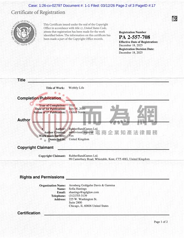 26-cv-2797 新款热门沙盒游戏《晃晃人生》Wobbly Life发起维权!相关周边文创产品立刻排查下架!