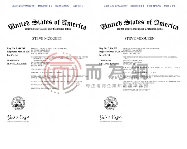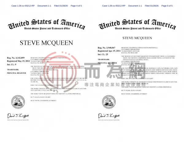 26-cv-212 好莱坞巨星Steve McQueen遗产信托发起跨境商标维权!67家店铺已被锁定,速排查下架!