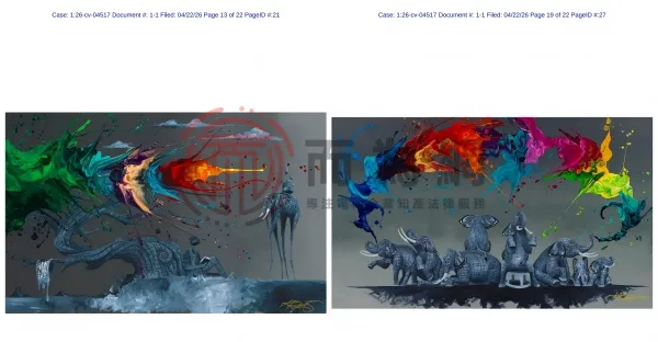 26-cv-4517 家居装饰画、海报周边类卖家速看!这7张黑白灰背景+高饱和泼墨涂鸦版权画正在维权!
