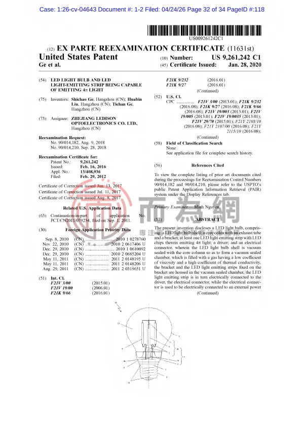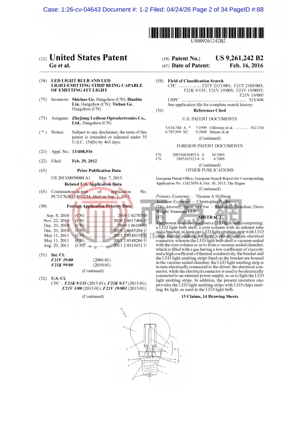 26-cv-4643 国人案件+1!全周光LED 灯泡及 LED 发光条专利维权中!相似产品立刻排查下架!